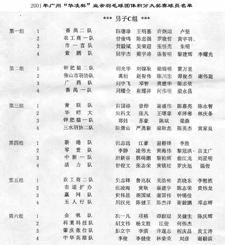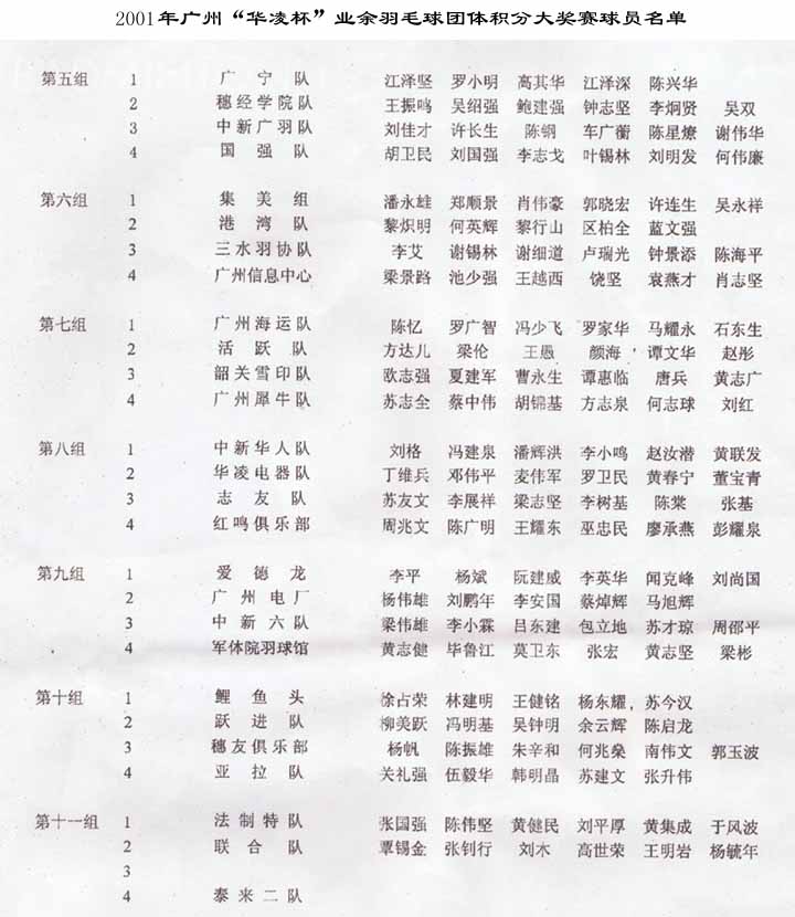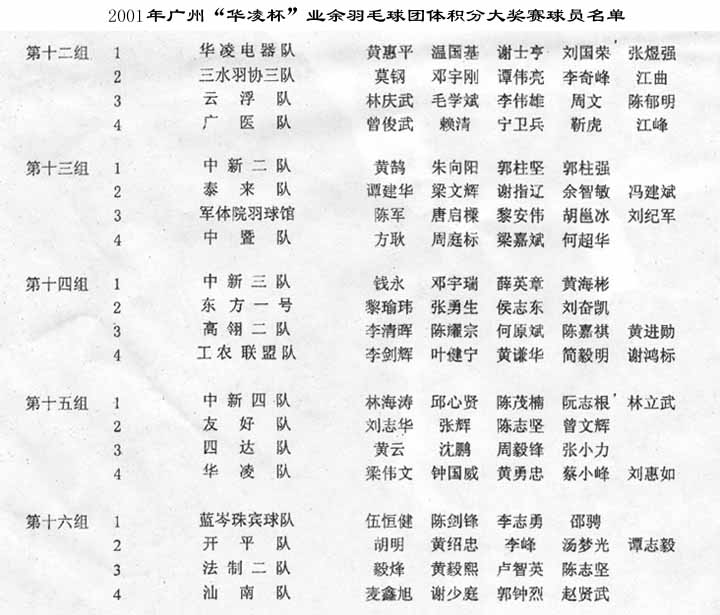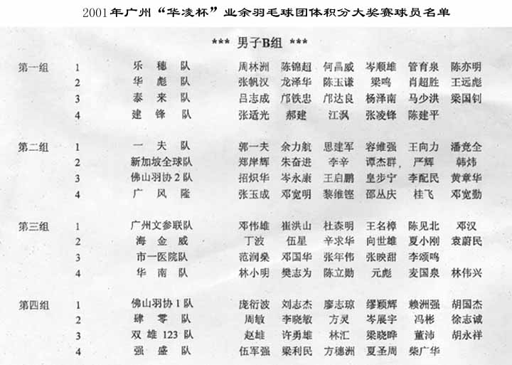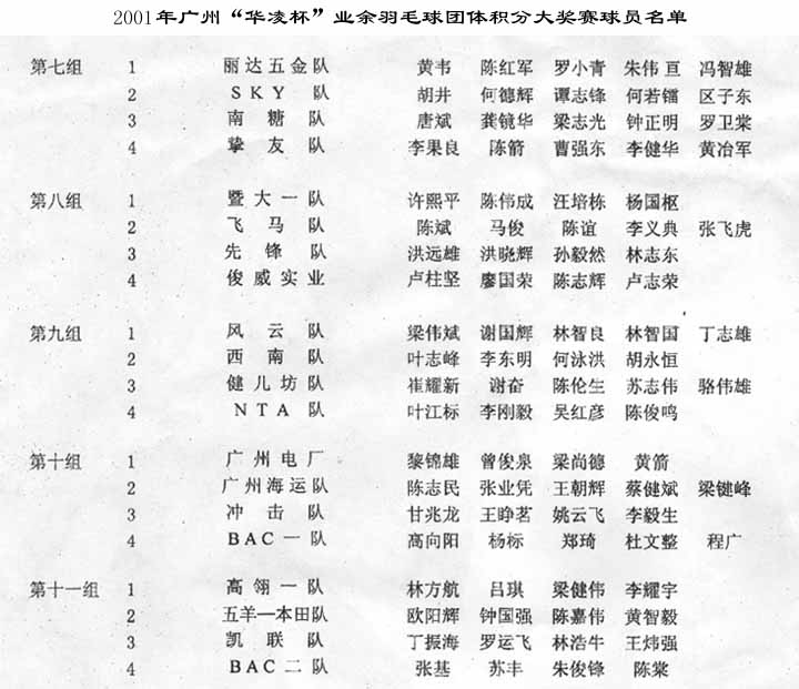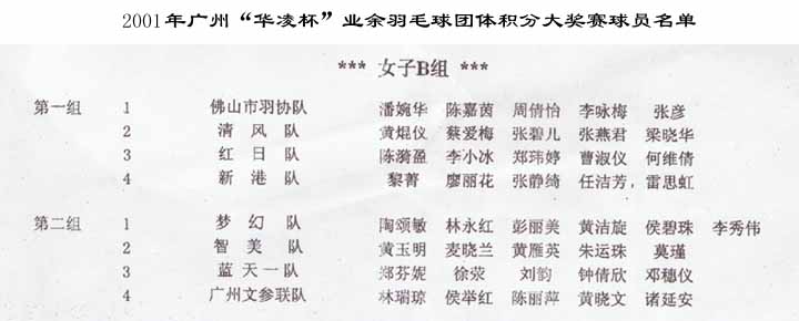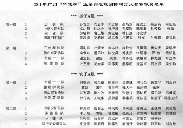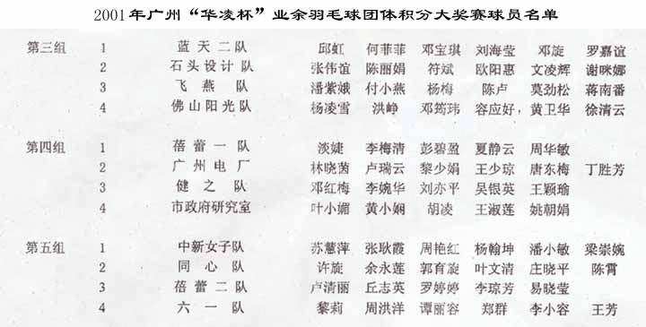 2001年廣州“華凌杯”業(yè)余羽毛球團(tuán)體積分大獎賽球員名單 |