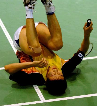 中國選手李煜救球時倒地,以1比2不敵馬來西亞選手李崇偉,無緣八強。 |