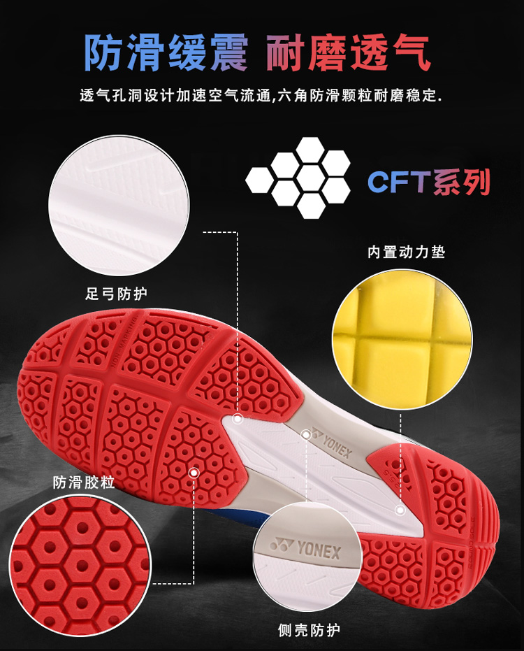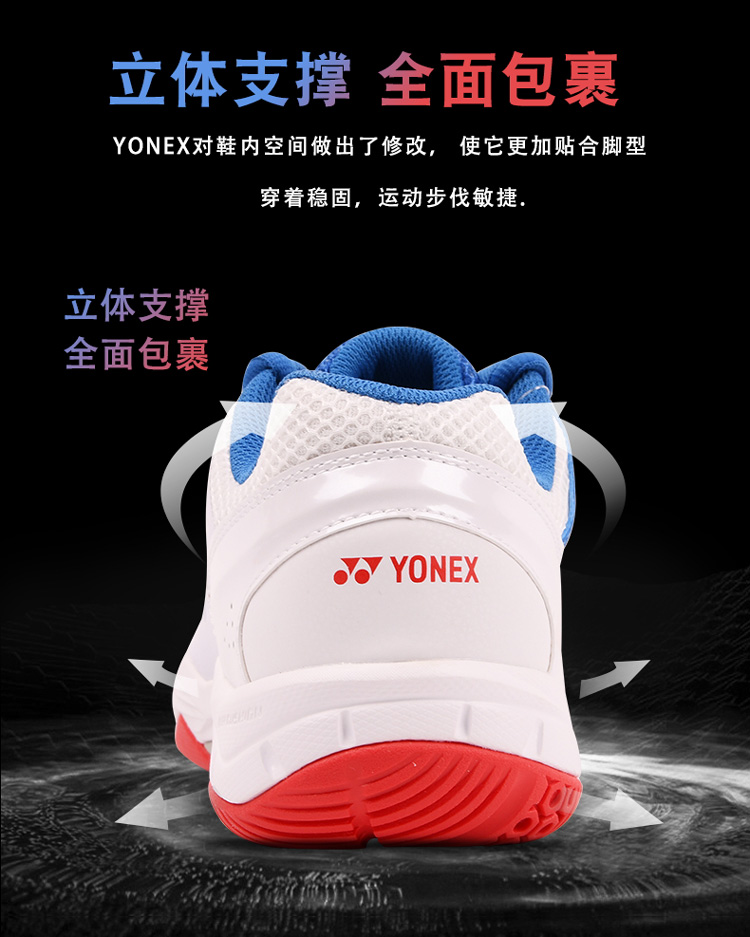 | 性能介紹 | 動力墊(Power Cushion):高密度復合結構動力墊在受到沖擊力后能迅速恢復原狀,減震性能好,有助于球員在球場上實現更迅敏、輕快的移動。 腳趾減壓鞋型(Toe Assist Shape):腳趾減壓鞋型設計能減小大腳趾所受壓力,同時也會提高腳中部和腳后跟的穩定舒適度,盡可能地減少球員在快速移動中能量的損耗。 TPU支撐片:鞋底中間位置安置了TPU支撐片,讓步伐變得更加穩定,增強了鞋底的牢固度,減少鞋子的扭曲。 輕量耐磨鞋面材料(Durable Skin Light):鞋面采用的這種輕型聚氨酯材料有類似橡膠般的柔韌性,又有硬塑料的硬度,在減輕鞋體重量的同時保證了鞋體的牢固性。 雙層拉舍爾透氣網面(Double Russel Mesh):超輕、耐用的拉舍爾細密纖維網眼結構,透氣性能比普通網面高8倍,能最大限度釋放鞋內的濕氣。 圓弧外底(Round Sole):YONEX圓弧外底給予運動時最大的能量轉移,為迅速流暢的步伐提供全方位的支撐。 六角膠粒外底(Hexagrip):六角膠粒外底較傳統材料減少20%重量和增加3%的抓地力,提供更敏捷穩定的步伐。 |