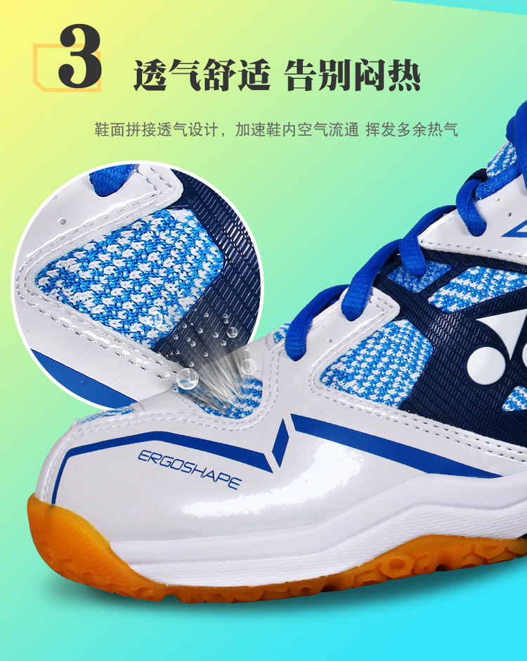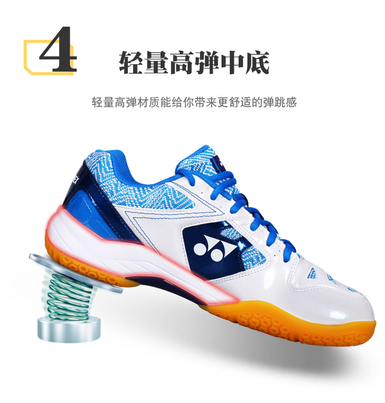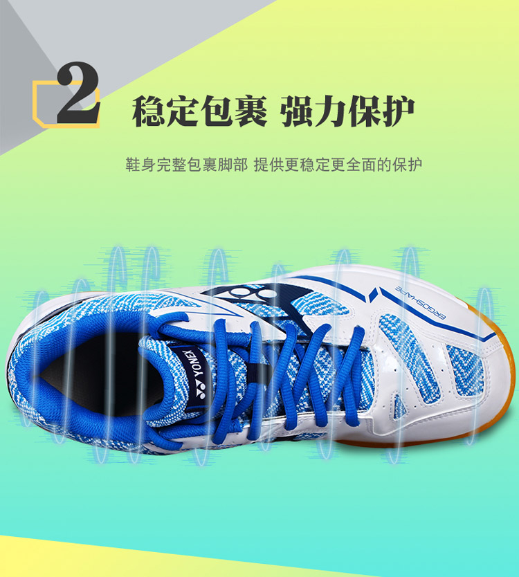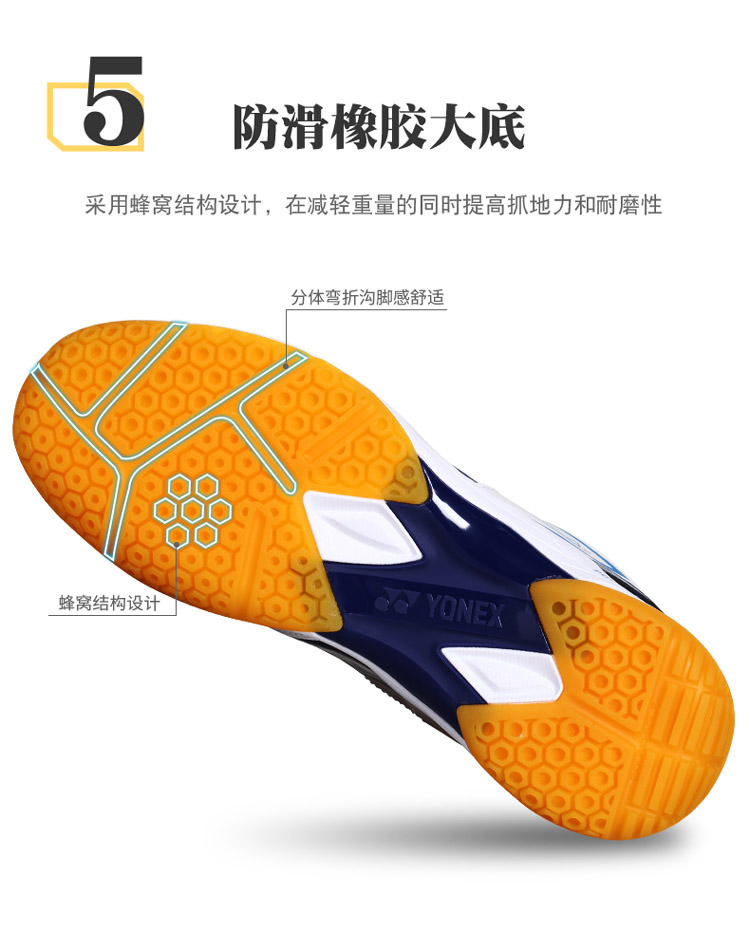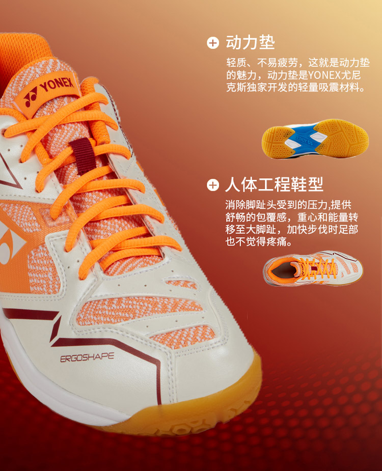 | 性能介紹 | 動力墊(Power Cushion):高密度復合結構動力墊在受到沖擊力后能迅速恢復原狀,減震性能好,有助于球員在球場上實現更迅敏、輕快的移動。 圓弧外底(Round Sole):YONEX圓弧外底給予運動時最大的能量轉移,為迅速流暢的步伐提供全方位的支撐。 人體工程鞋型:消除腳趾頭受到的壓力,提供舒暢的包裹感,重心和能量轉移至大腳趾,加快步伐時足部也不覺得疼痛。 TPU支撐片:鞋底中間位置安置了Z字形的TPU支撐片,讓步伐變得更加穩定,增強了鞋底的牢固度,減少鞋子的扭曲。 六角膠粒外底(Hexagrip):六角膠粒外底較傳統材料減少20%重量和增加3%的抓地力,提供更敏捷穩定的步伐。 |